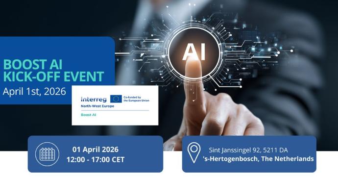On 1 April 2026,Interreg NWE Boost AIofficially launches atJADS - Jheronimus Academy of Data Sciencein ’s-Hertogenbosch. From 12:00 to 17:00 CET, partners and stakeholders will come together to kick off this three-year Interreg North-West Europe collaboration.